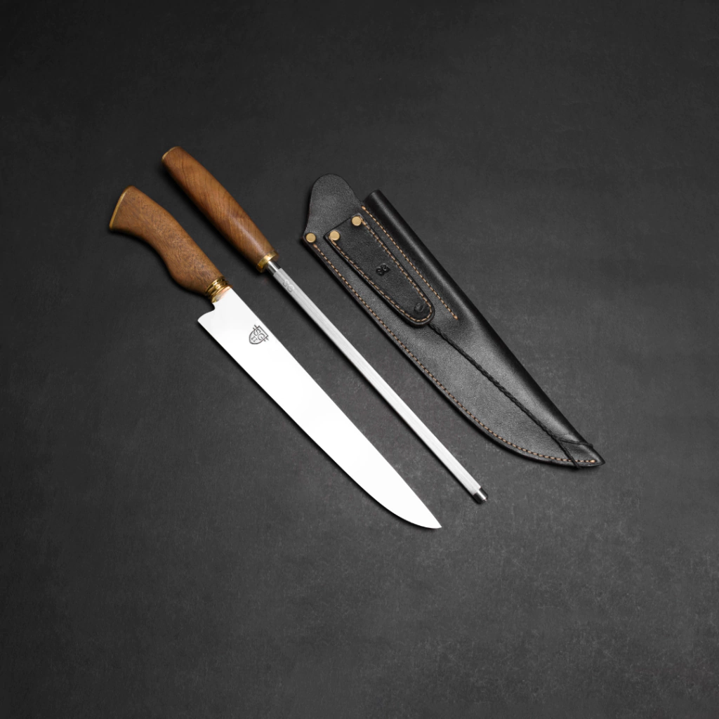 Com lâmina em aço inox 420C, a faca oferece cortes firmes e controle em diferentes tipos de preparo. Já a chaira garante praticidade na manutenção do fio, mantendo sua faca sempre pronta para uso.