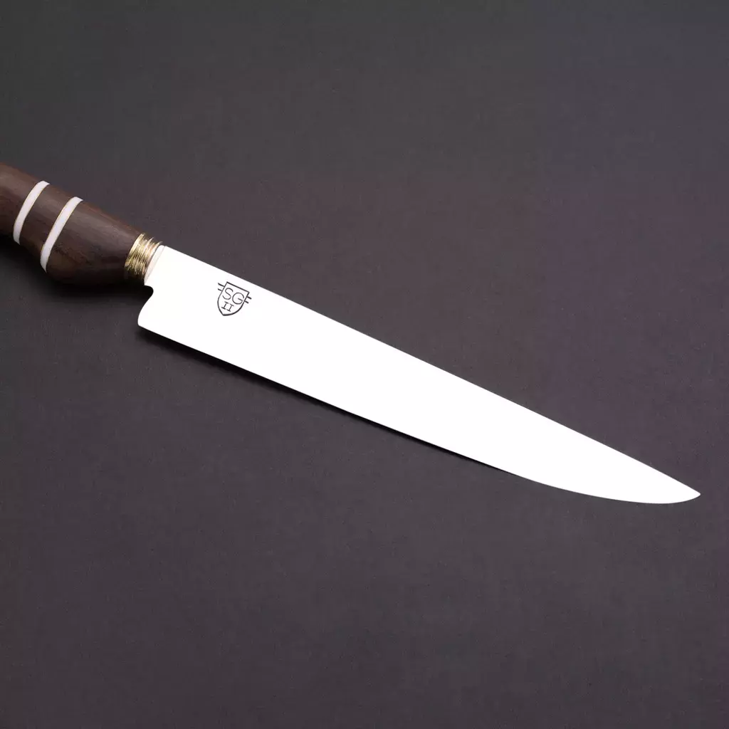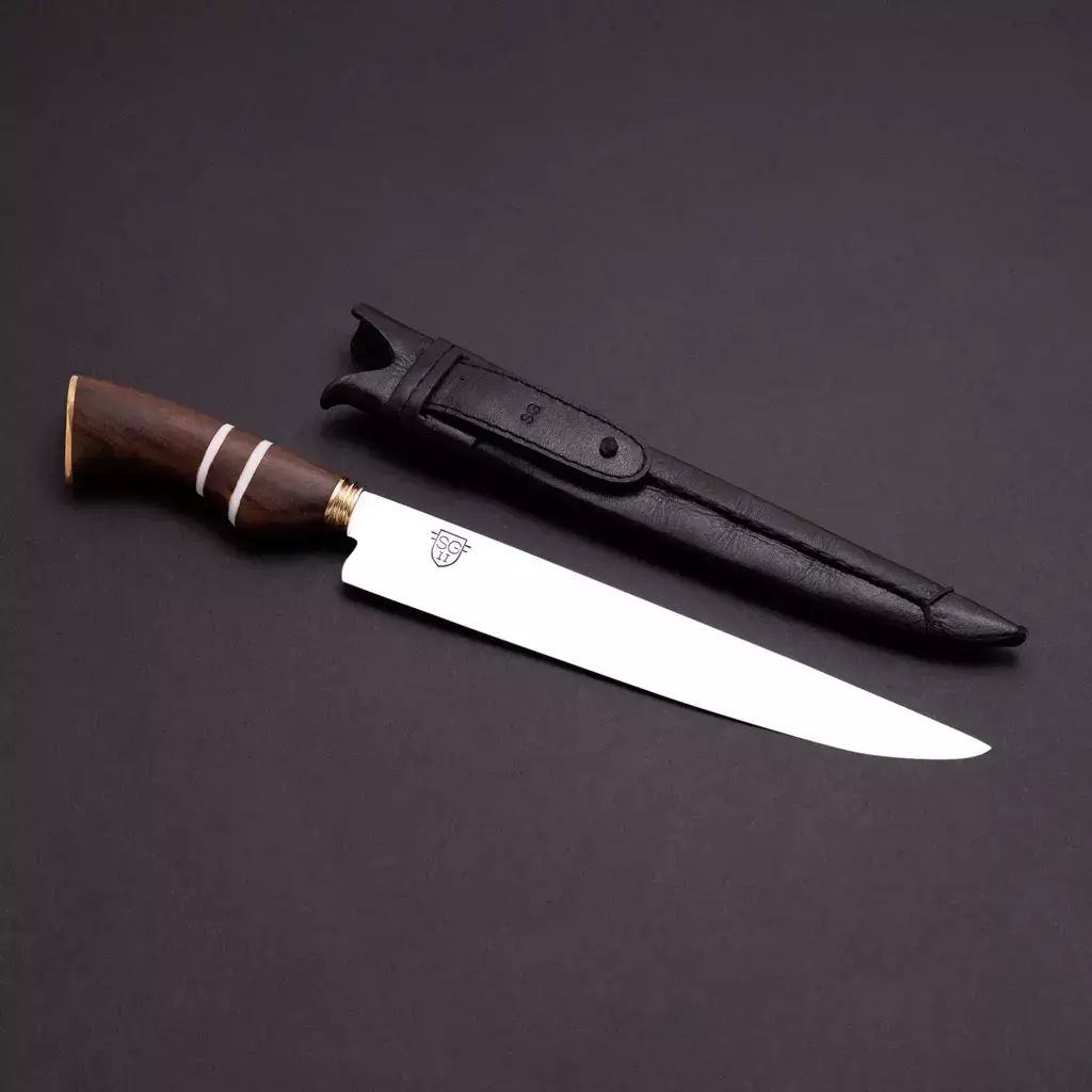 Seu cabo em madeira nobre com resina traz elegância, ergonomia e exclusividade: cada peça é única, com variações naturais de cor e design. Compacta e equilibrada, é perfeita para cortes médios, legumes, frutas, carnes e preparos do dia a dia, tanto na cozinha quanto no churrasco.
