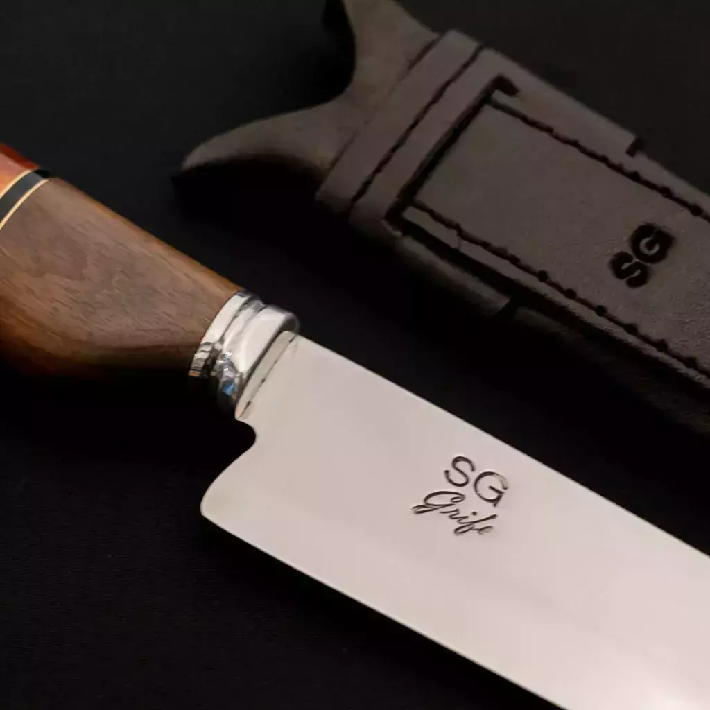A Faca Grife SG de 9 polegadas é uma peça artesanal de altíssimo padrão, desenvolvida para quem busca elegância, versatilidade e desempenho superior. Produzida em aço inoxidável 420C temperado (55 HRC), possui lâmina afiada de 23 cm, ideal para cortes precisos de carnes, legumes e preparos diversos.