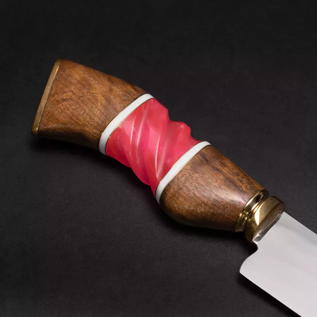 Com um cabo ergonômico em madeira nobre e resina rosa artesanal, cada peça se torna exclusiva, trazendo um toque de requinte à cozinha ou ao churrasco.