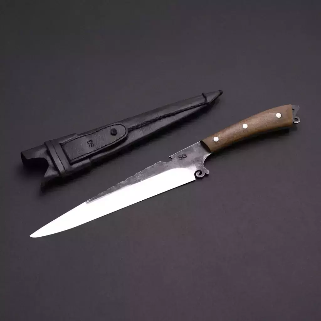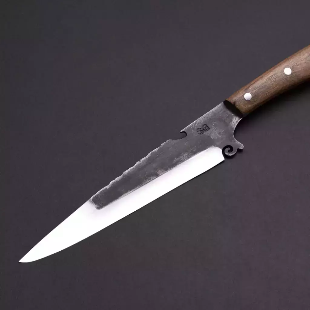 Forjada com lâmina em aço carbono de 3 mm e cabo em madeira de imbuia, essa peça entrega durabilidade, equilíbrio e um fio que assusta. O modelo conta com estrutura full tang e funções extras que tornam a faca ainda mais versátil: abre garrafas, torce arames e quebra gelo.